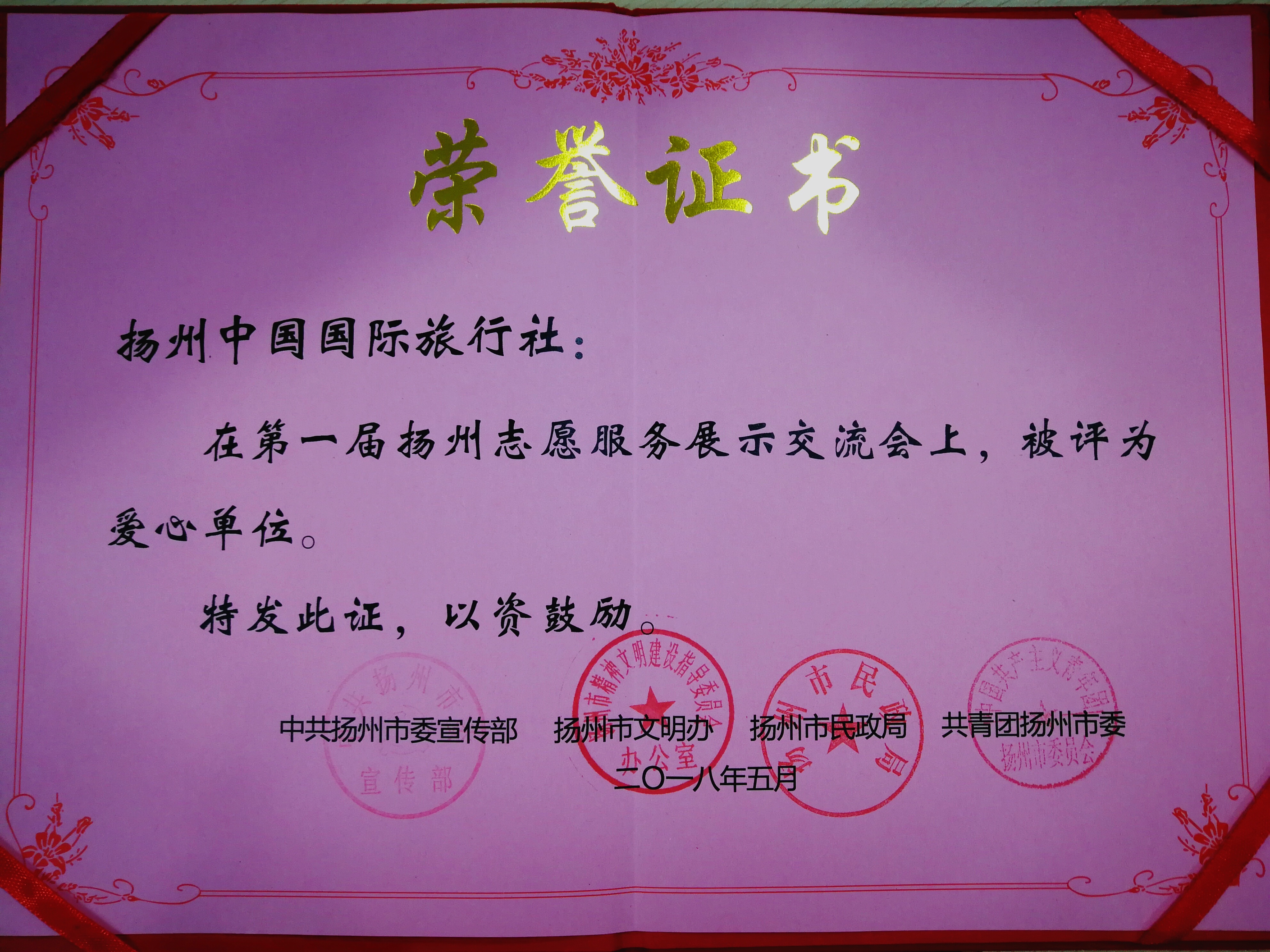 揚(yáng)州國旅被評(píng)為第一屆揚(yáng)州志愿服務(wù)展示交流會(huì)“愛心單位”