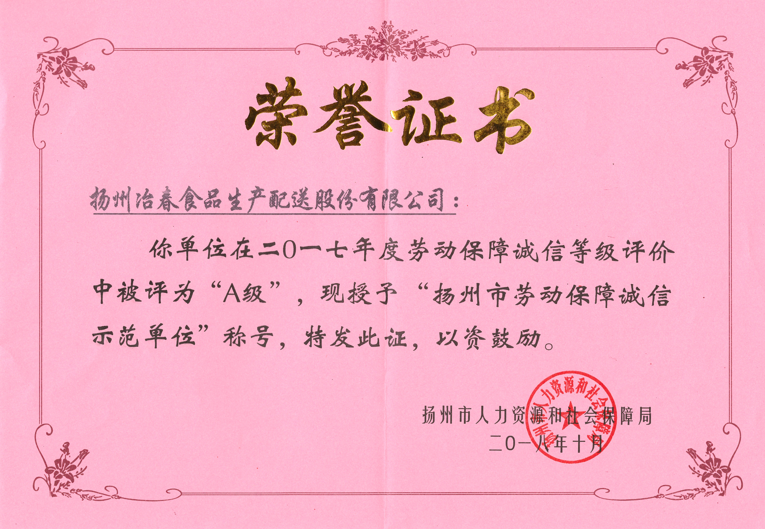 冶春食品榮獲市勞動保障誠信示范單位