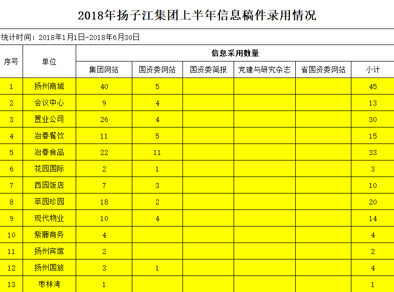 2018年二季度,市國資委共采用集團(tuán)信息稿件60篇,在14家市屬國企里排名第一(一季度采用33篇,排名第三。上半年共采用93篇,排名第二)。這是各單位及集團(tuán)各部門高度重視、積極寫稿投稿、共同努力的結(jié)果?,F(xiàn)將揚(yáng)子江集團(tuán)2018年上半年信息稿件采用情況統(tǒng)計(jì)如下,望各單位及集團(tuán)各部門下半年繼續(xù)挖掘工作亮點(diǎn)、撰寫報(bào)送信息、共同完成宣傳工作,并在保證數(shù)量的同時(shí)提高稿件質(zhì)量。