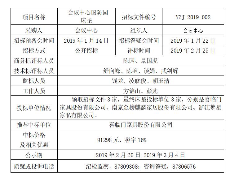 備注:投標人對招標結果有疑問的,應采用書面形式,寫清質疑內容、具體事實和理由并附相關證據(jù)材料,由法定代表人簽字并加蓋單位公章后在公示期內送達指定部門。 揚子江集團集中采購辦 2019年2月26日
