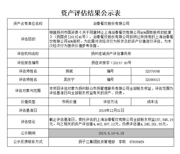一、經(jīng)過甄選比價,冶春餐飲股份有限公司選聘揚州佳誠資產(chǎn)評估事務(wù)所承擔(dān)本次股權(quán)轉(zhuǎn)讓的評估工作,評估基準(zhǔn)日為2018年12月31日(相關(guān)評估內(nèi)容見《資產(chǎn)評估結(jié)果公示表》)。