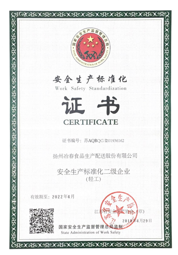 冶春食品被評國家級安全生產(chǎn)標(biāo)準(zhǔn)化二級企業(yè)