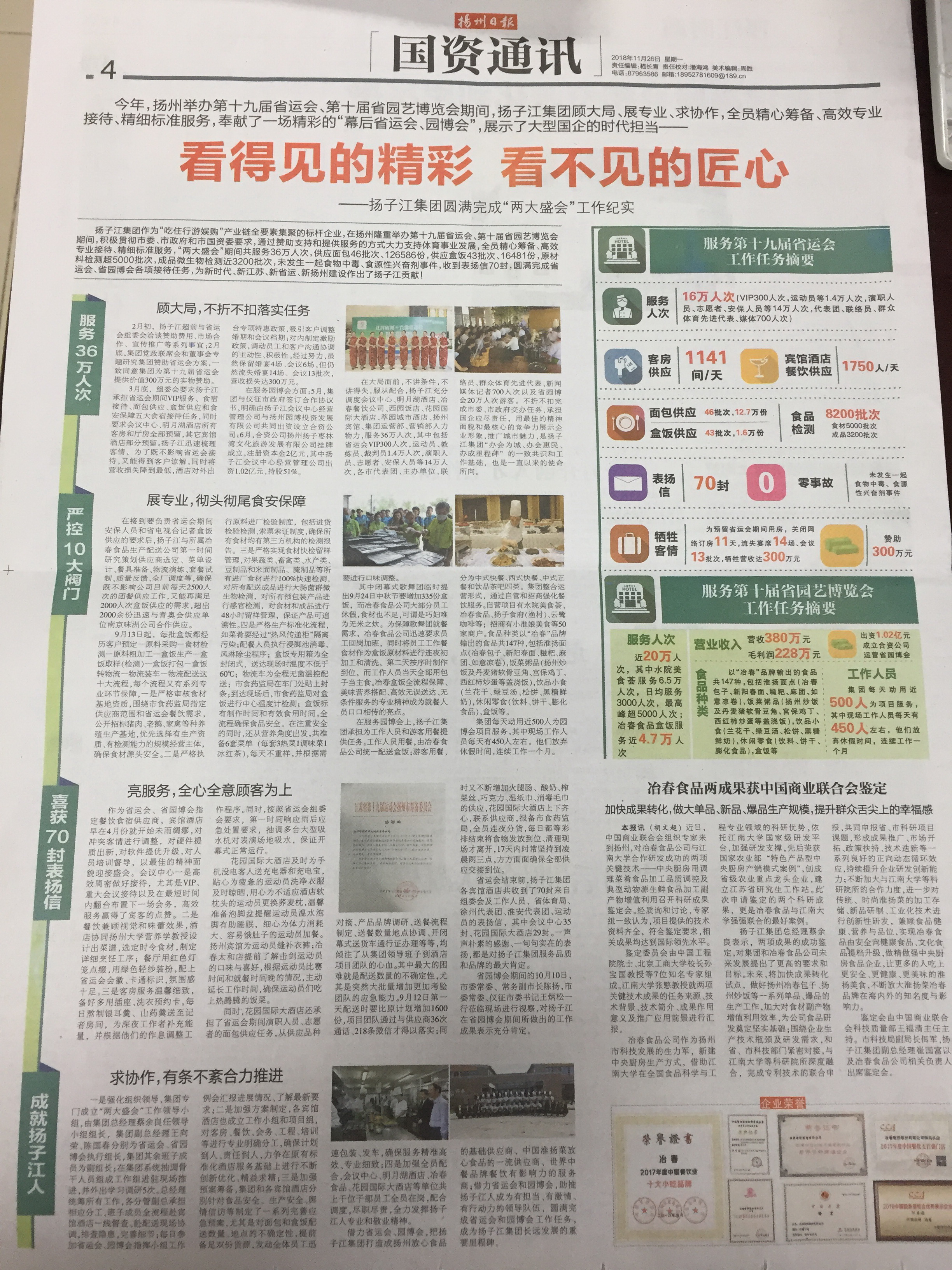 2018年11月26日,《揚(yáng)州日?qǐng)?bào)》國(guó)資通訊欄目專版刊登“看得見的精彩 看不見的匠心——揚(yáng)子江集團(tuán)圓滿完成‘兩大盛會(huì)’工作紀(jì)實(shí)”新聞,用圖表、文字形式全面詳細(xì)展示集團(tuán)在省運(yùn)會(huì)、省園博會(huì)兩大活動(dòng)中付出的努力和取得的成效,高度點(diǎn)贊集團(tuán)在的國(guó)企擔(dān)當(dāng)。